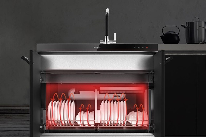 下層“干”區(qū)域為烘干+儲物功能,為餐具提供一個潔凈干爽的儲存環(huán)境,并有效預(yù)防細菌滋生,適于長久儲存碗碟。
